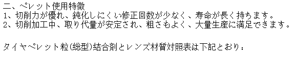 | 1、金屬結(jié)合剤ペレット | 2、樹脂結(jié)合剤ペレット | | 圧力 | 300-500g/cm2? | 圧力 | 200-400g/cm2?????? | | 回転速度 | 1000-2000rpm | 回転速度 | 1000-2000rpm | | 加工時間 | 10-20sec | 加工時間 | 15-25sec | | 切削量 | 0.06-0.08mm | 切削量 | 0.01-0.015mm |