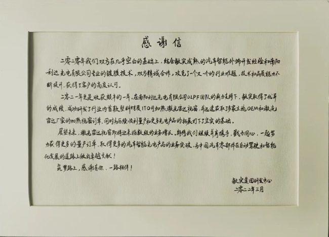 敏實(shí)集團(tuán)研發(fā)中心感謝信 |